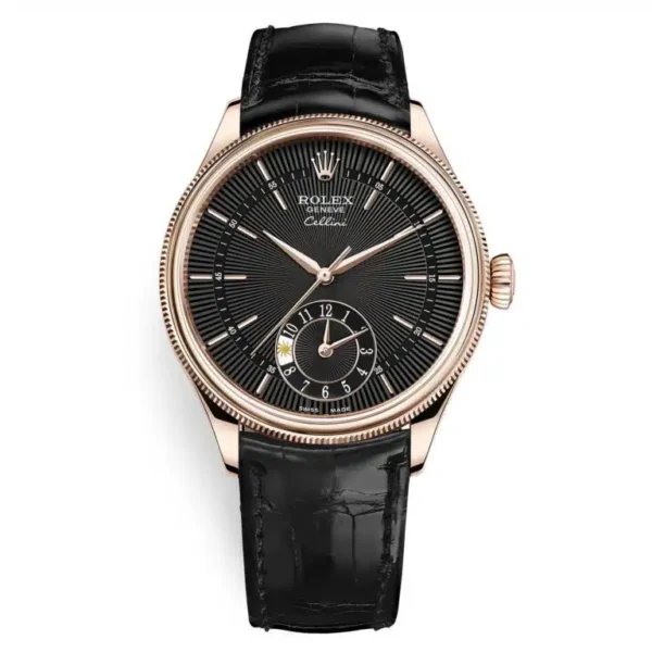 Tags: 18k Gold Rolex, Black Face Rolex, Rolex Cellini Rose Gold, Rolex Leather Band, Rose Gold Rolex